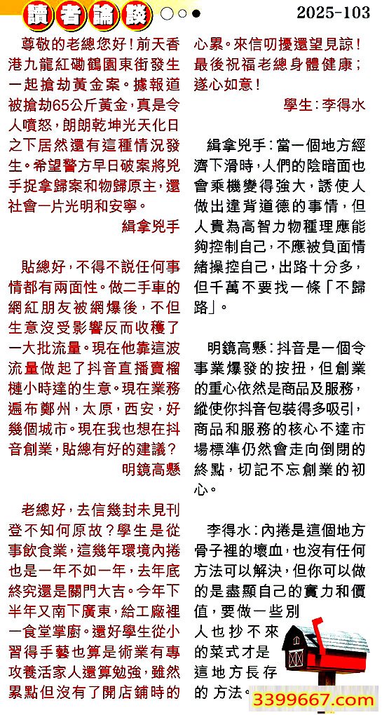 3.老總好,去信幾封未見刊登不知何原故?學生是從事飲食業,這幾年環境內捲也是一年不如一年,去年底終究還是關門大吉。今年下半年又南下廣東,給工廠裡一食堂掌廚。還好學生從小習得手藝也算是術業有專攻養活家人還算勉強,雖然累點但沒有了開店鋪時的心累。來信叨擾還望見諒!最後祝福老總身體健康;遂心如意!====學生:李得水