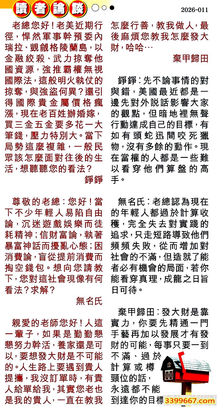 1.老總您好!老美近期行徑,悍然軍事幹預委內瑞拉、覬觎格陵蘭島,以金融絞殺、武力掠奪他國資源,強推霸權無視國際法,這般明火執仗的際掠奪,與強盗何異?還引得國際貴金屬價格瘋漲,現在老百姓辦婚嫁,買三金五金要多花一大筆錢,歴力特別大。當下局勢這麼複雜,一般民眾該怎麼面對往後的生活,想聽聽您的看法?====錚錚