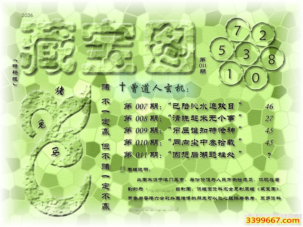 011期藏寶圖 新:因想后湖题柱处 老:汉城黄柳映新帘 禁:虎 禁:4尾